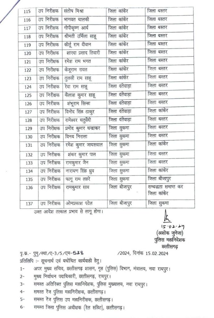 छत्तीसगढ़ पुलिस विभाग में हुआ बड़ा फेरबदल , 137 पुलिस कर्मियों का हुआ तबादला , पुलिस महानिदेशक जुनेजा ने जारी किया आदेश …