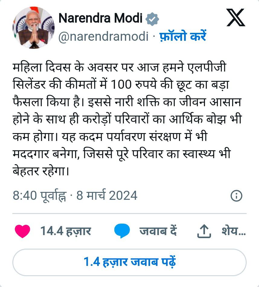 इसमें उन्होंने लिखा है कि (महिला दिवस के अवसर पर आज हमने LPG सिलेंडर की कीमतों में ₹100 की छूट का बड़ा फैसला किया है । इससे नारी शक्ति का जीवन आसान होने के साथ ही करोड़ों परिवारों का आर्थिक बोझ भी काम होगा।यह कदम पर्यावरण संरक्षण में भी मददगार बनेगा , जिससे पूरे परिवार का स्वास्थ्य भी बेहतर रहेगा । )